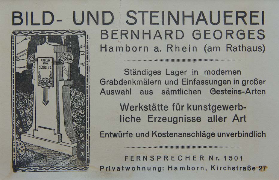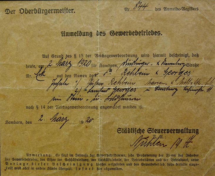 Am 02.März 1920 wurde das ursprüngliche Unternehmen bei der städtischen Steuerverwaltung in Duisburg-Hamborn als "Rehbein & Georges", Inhaber Johann Rehbein (Steinmetzmeister) und Bernhard Georges (Technischer Zeichner) angemeldet.
